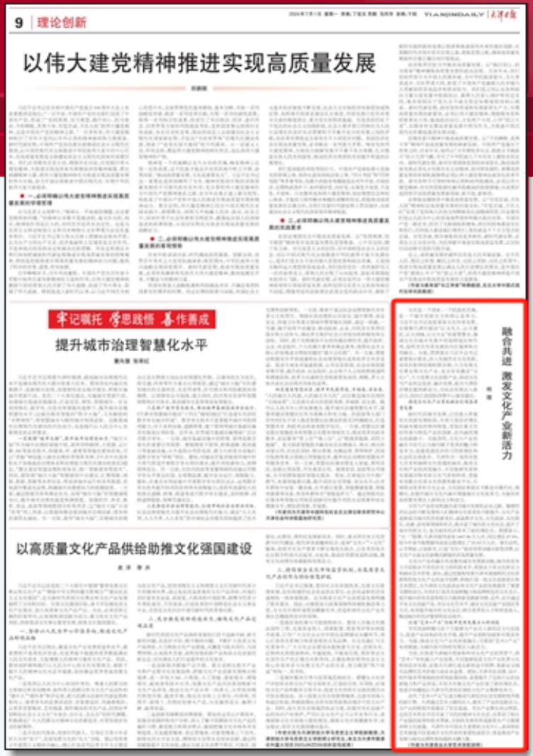 7月1日,《天津日报》(理论创新版)刊发beat365官网艺术学院何理老师理论文章“融合共进 激发文化产业新活力”。文章指出,习近平总书记高度重视文化传承发展,在视察天津时提出“以文化人、以文惠民、以文润城、以文兴业”的重要要求,强调文化在城市发展中的独特地位和作用,指明文化传承发展的内在规律和方向路径。