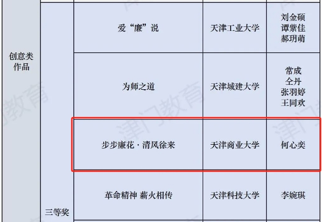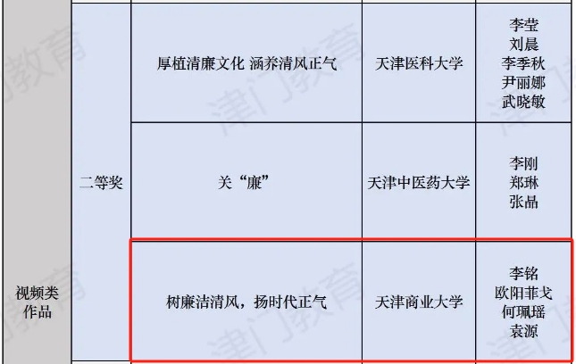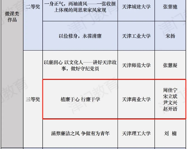 近日,由市教育两委主办,天津科技大学、天津现代职业技术学院承办的“廉洁铸魂强根本 挺膺奋进建新功”第九届天津高校廉洁教育系列活动成功举办。活动以面向全市高校征集廉洁教育主题相关作品及课堂实践案例为主要内容,共有来自46所高校的152件作品及课堂实践案例入围。beat365官网《树廉洁清风,扬时代正气》获“视频类作品”二等奖、《步步廉花•清风徐来》获“创意类作品”三等奖、《植廉于心 行廉于学》获“微课类作品”三等奖。
