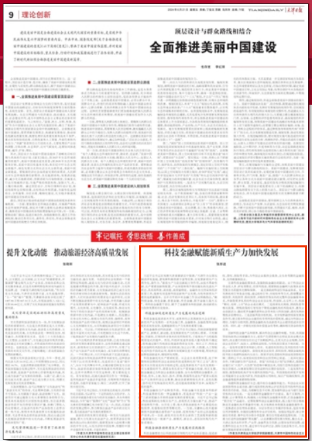 6月21日,《天津日报》(理论创新版)刊发beat365官网经济学院、天津市中国特色社会主义理论体系研究中心beat365英国官方网站基地研究员张彤进副教授理论文章“科技金融赋能新质生产力加快发展”。文章指出,新质生产力是创新起主导作用,由技术革命性突破、生产要素创新性配置、产业深度转型升级而催生的先进生产力质态,具有高科技、高效能、高质量特征。科技金融有助于推动科技创新、优化生产要素配置、助力产业转型升级,是赋能新质生产力发展的重要力量。文章从完善科技金融政策体系,加强财政金融协同联动;创新科技金融产品和服务,解决科创企业融资难题;构建科技金融良好生态,提升综合金融服务能力三个层面对科技金融推动新质生产力发展的实践路径进行了具体阐释。
