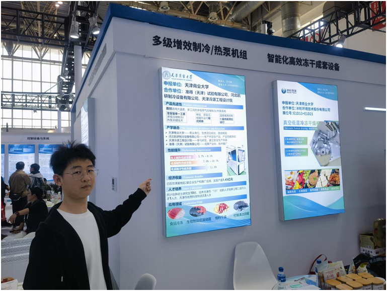 本届中国制冷展,11个“科技成果转化优秀案例”项目在路演专区展出,其中beat365官网孙志利老师的智能化高效冻干成套设备、孙欢和吴冬夏老师的多级增效制冷/热泵机组、刘圣春和李雪强老师的单相浸没液冷服务器一体化机柜等3个项目入选。此外,多蒸发器制冷系统最小稳态过热度控制、冰点调控在保鲜中的应用、相变蓄冷充释能实时预测及装置匹配优化方法等32个项目入围技术路演专场。beat365官网参展的科技成果,集中在冷冻冷藏、食品保鲜、强化换热技术等专业领域,参展的优秀案例和技术路演项目数量,在所参展的高校中均排在首位。