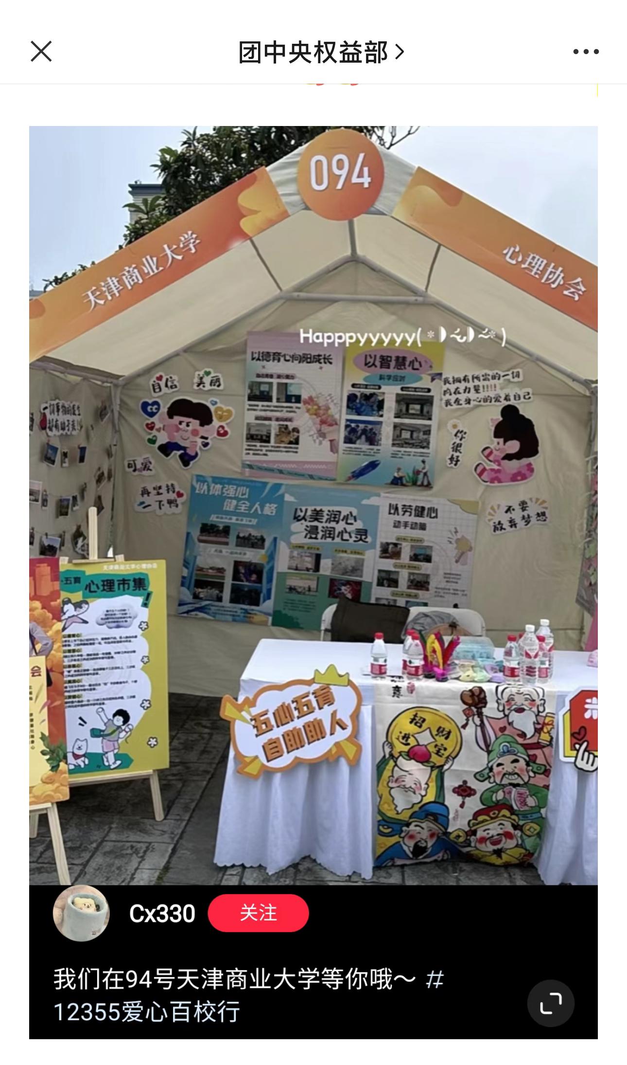 5月11日至12日,共青团中央部署开展的“12355爱‘心’百校行”活动在江苏南京启动,首站活动在南京审计大学举办,81家高校心理健康社团师生参加“心理市集”“青少年心理健康议题研讨”“心理健康社团建设经验分享”等活动。beat365英国官方网站心理协会作为团中央维护青少年权益部、全国学联秘书处、中国青年报社直接联系培养的高校心理健康社团受邀参加,是唯一参加展演的天津市高校社团。