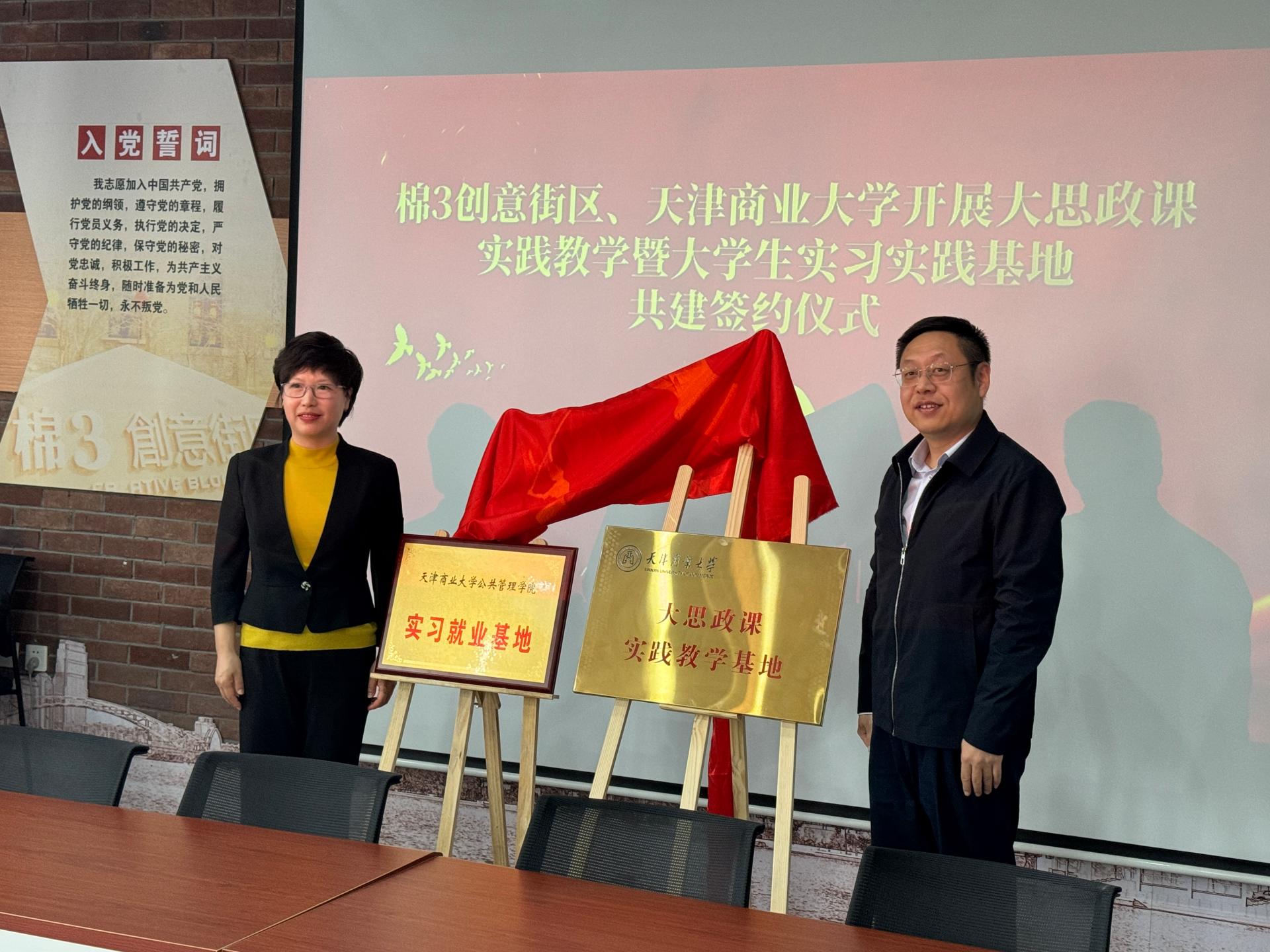 会上,王立云、王斌共同为beat365英国官方网站“大思政课实践教学基地”和“实习就业基地”揭牌,马克思主义学院与天津新岸创意产业投资有限公司签署了共建合作协议。