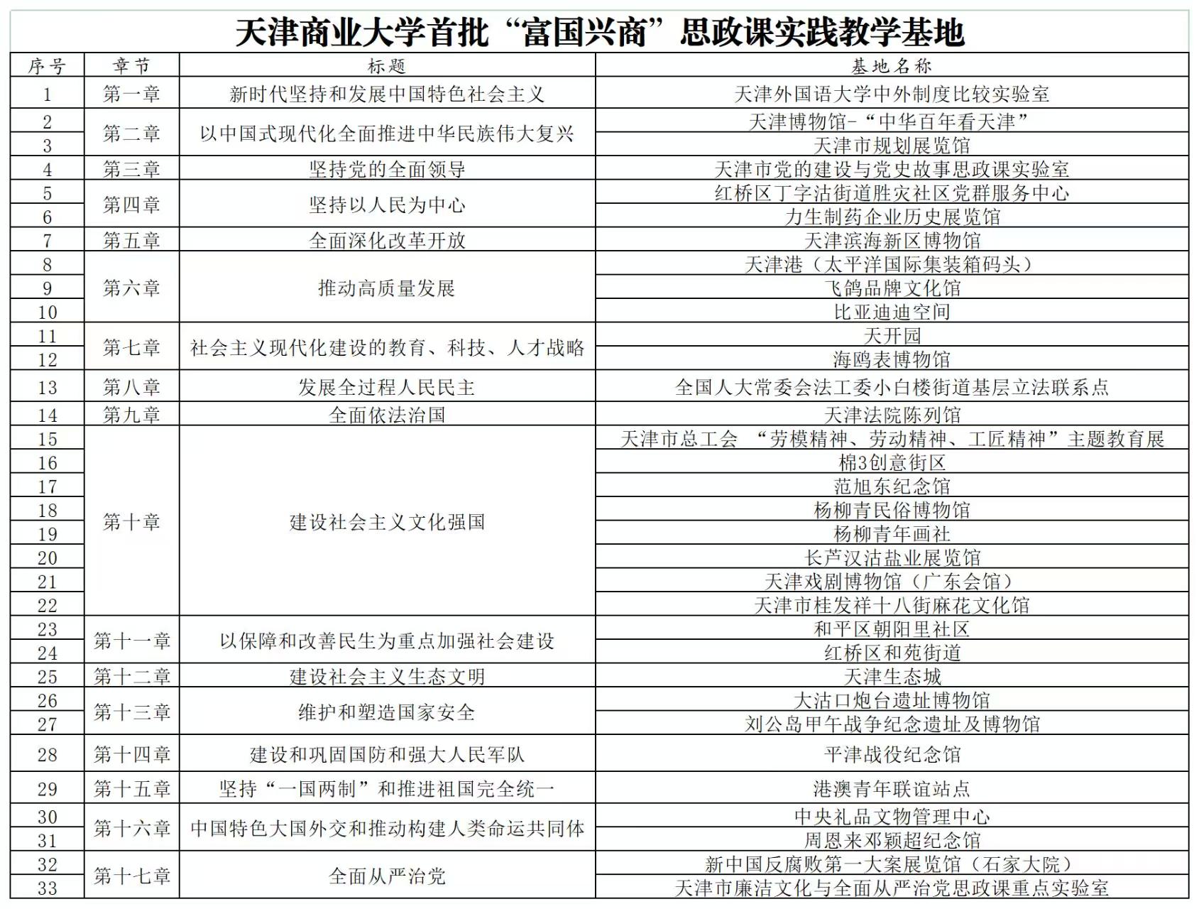 首批建成的33个实践教学基地,类型多样、覆盖面广、资源富集,对应习近平新时代中国特色社会主义思想概论课程的17个专题章节,蕴含着各门思政必修课的教学重点,集中体现了党的十八大以来党和国家发生的历史性成就和发生的历史性变革,昭示着中国共产党的初心使命和性质宗旨,体现着革命文化的红色基因、中华优秀商业文化的时代价值。以基地为依托开展实践教学,打破了思政课各门课程的壁垒,形成课程之间的有机联动、系统整合,构建起了内容丰富、特色鲜明、覆盖面广的思政课实践教学基地体系,尤其是重点建设的7个老字号的实践教学基地,蕴含着鲜明的工商文化、津派文化特征,是开展“老字号里的思政课”的有利场所。