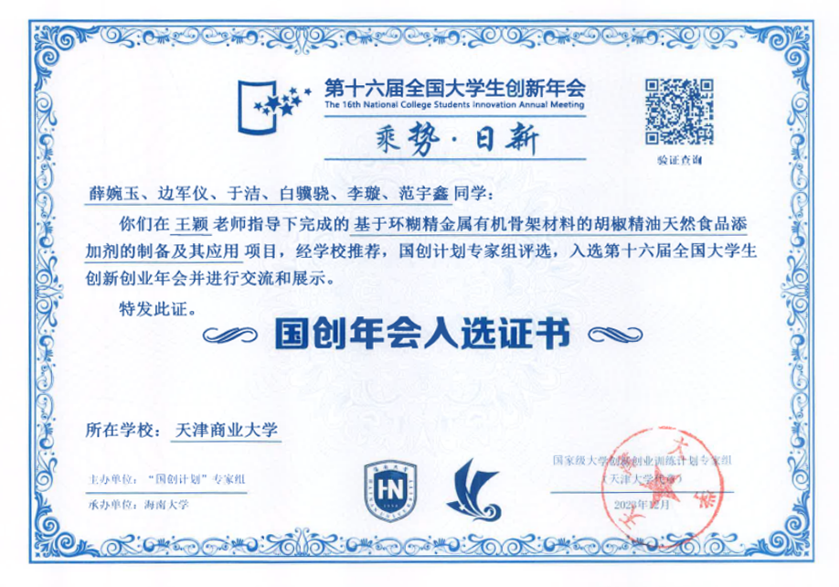 该项目2021年获批国家级“大创计划”立项项目。项目以胡椒为研究对象,采用绿色提取方法超声——微波协同萃取法提取胡椒精油,首创基于环糊精金属有机骨架改性的胡椒精油作为天然食品添加剂,并将其应用于不同类型的食品保鲜。项目团队首创的食品添加剂具有天然、绿色、安全的优势,经过改性后的精油显著提高了稳定性和抗氧化性。此外,本项目已有2项专利提交申请(实用新型与发明专利),获得7次教育部上榜赛事的国家级及省部级奖项,发表1篇SCI一区TOP论文,2篇EI论文,1篇中文核心论文。