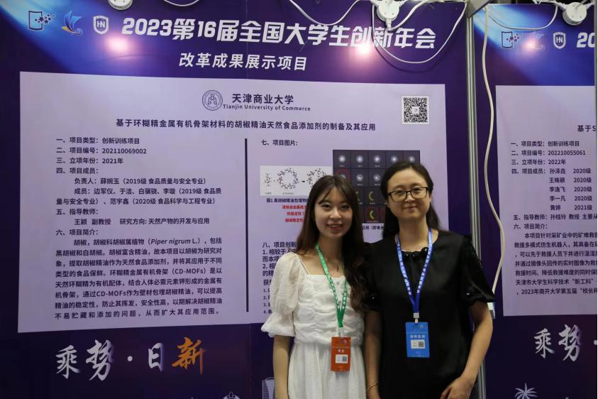 近日,以“乘势·日新”为主题的第十六届全国大学生创新创业年会(以下简称“国创年会”)在海南大学举办。beat365官网国家级“大创计划”项目——“基于环糊精金属有机骨架材料的胡椒精油天然食品添加剂的制备及其应用”从全国近300所高校推荐的项目中脱颖而出,成功入选本次年会。项目指导教师生物技术与食品科学学院王颖副教授和团队负责人薛婉玉同学及教务处相关负责教师参会,并为参观师生讲解项目。
