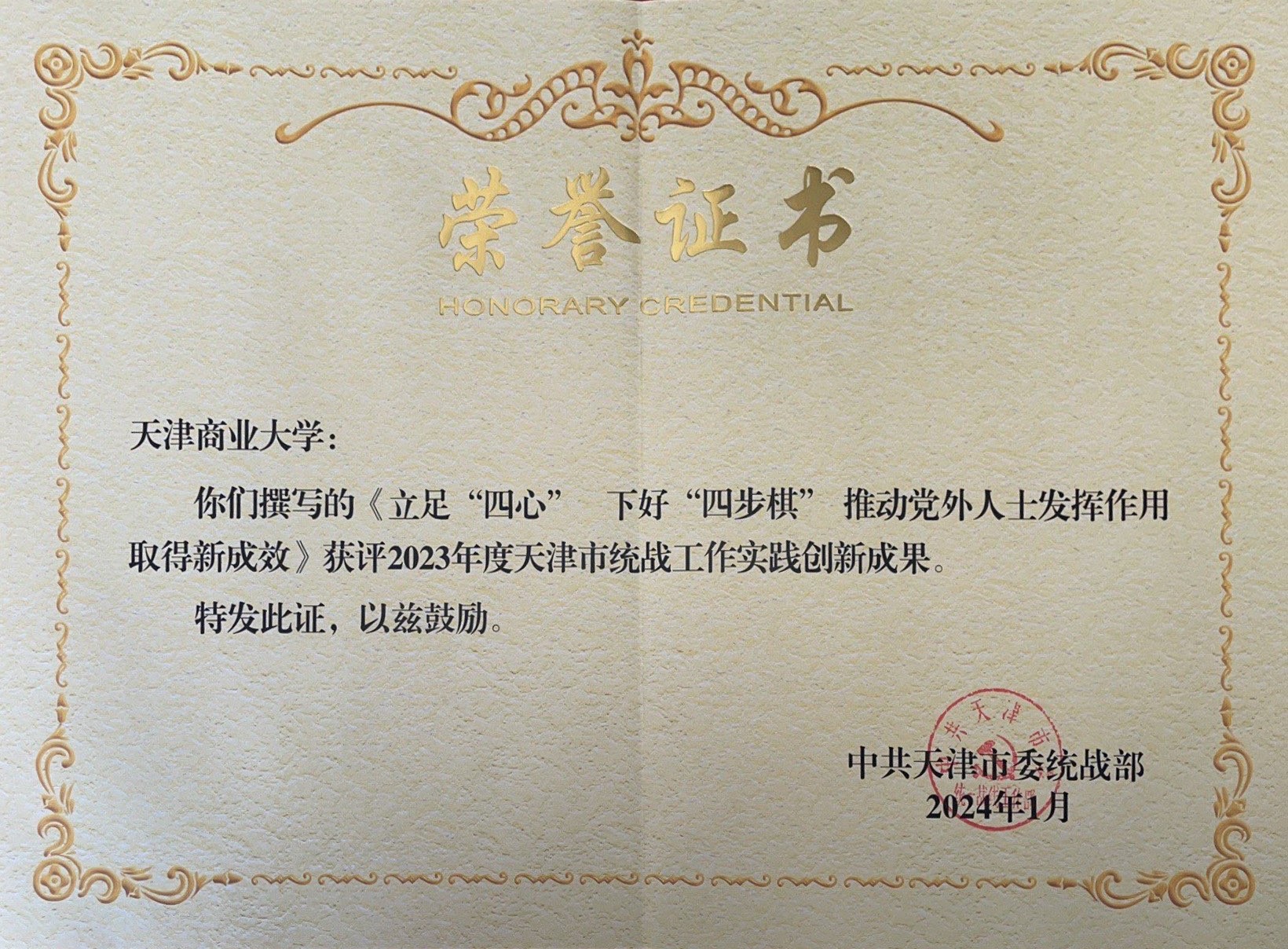 自2023年度成果申报工作启动以来,beat365官网教职工积极参与、精心选题,有组织开展统战理论政策与实践工作研究创新,共申报成果12项。其中,由党委统战部完成的《立足“四心” 下好“四步棋” 推动党外人士发挥作用取得新成效》获天津市统战工作实践创新成果,由公共管理学院赵银红、王娜英完成的《统一战线制度优势转化为社区治理效能的过程机理及优化路径》获天津市统战理论政策研究成果二等奖。