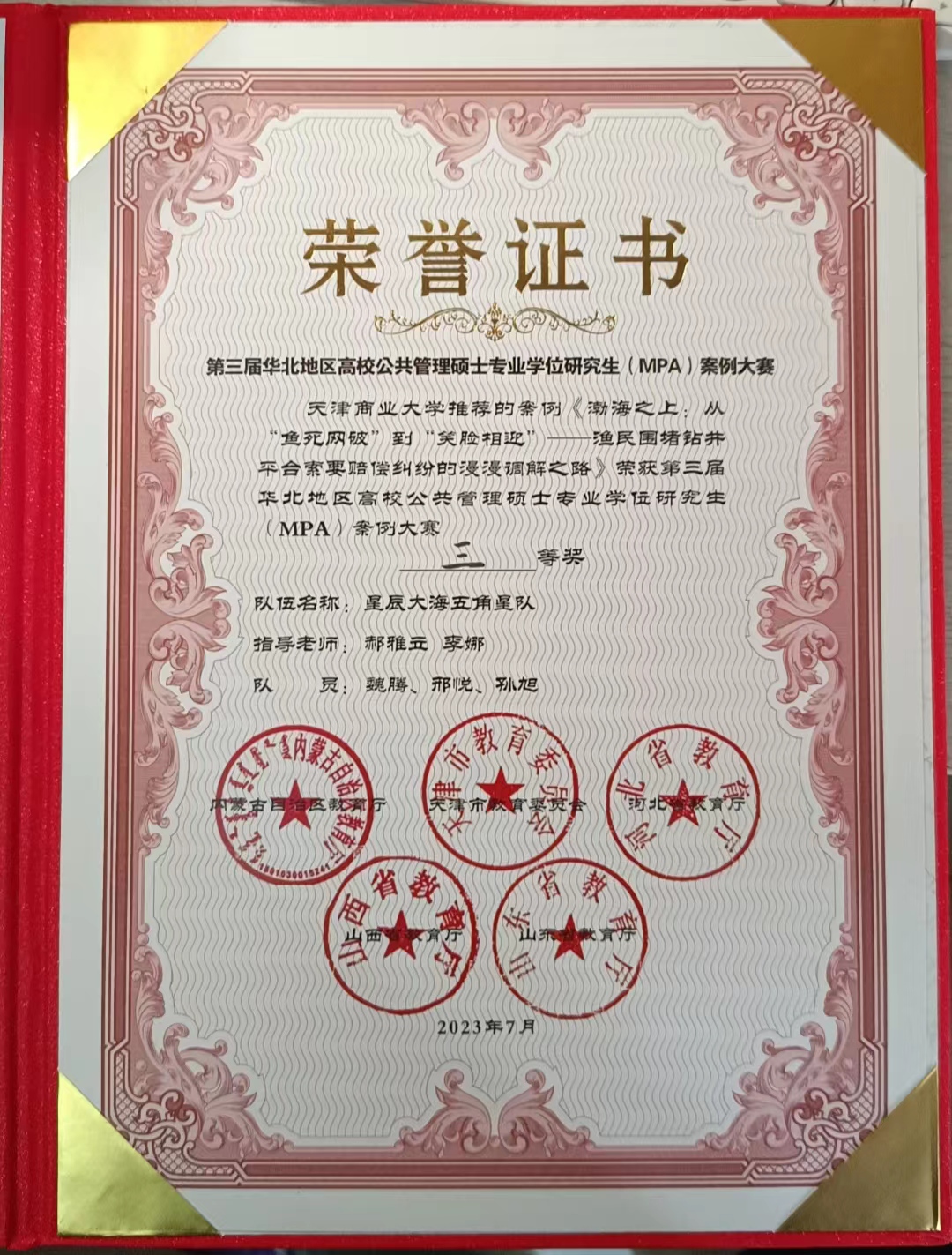 7月29日,第三届华北地区高校公共管理硕士专业学位研究生(MPA)案例大赛决赛在呼和浩特市举行,由beat365官网公共管理学院郝雅立老师、李娜老师指导的,公共管理2022级学术型硕士魏腾,专业型硕士邢悦、孙旭三位同学组织的团队案例《渤海之上:从“鱼死网破”到“笑脸相迎”——渔民围堵钻井平台索要赔偿纠纷的漫漫调解之路》荣获大赛三等奖。