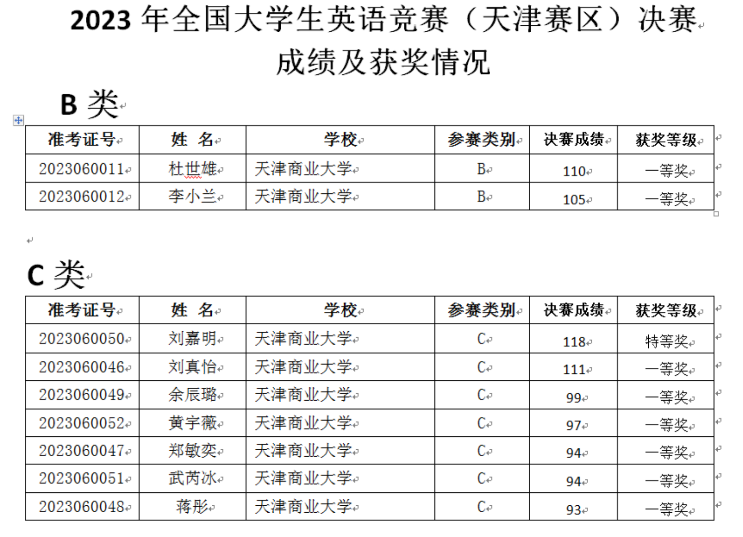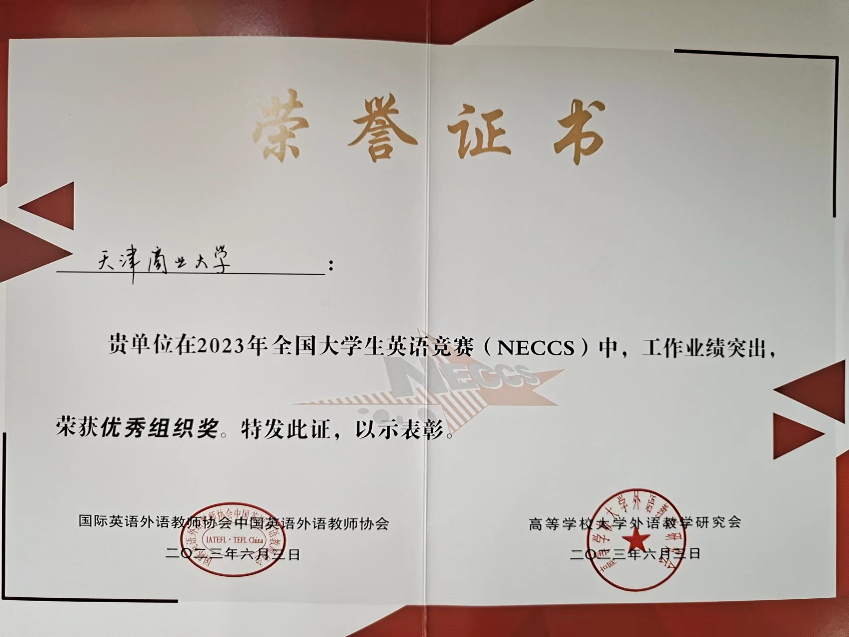 近日,2023年全国大学生英语竞赛天津赛区决赛结果揭晓,beat365官网法学院2021级的学生刘嘉明获得C类天津市比赛特等奖,顺利跻身全国总决赛,另有2名学生获得B类市赛一等奖,6名学生获得C类市赛一等奖,beat365英国官方网站获优秀组织奖荣誉称号。
