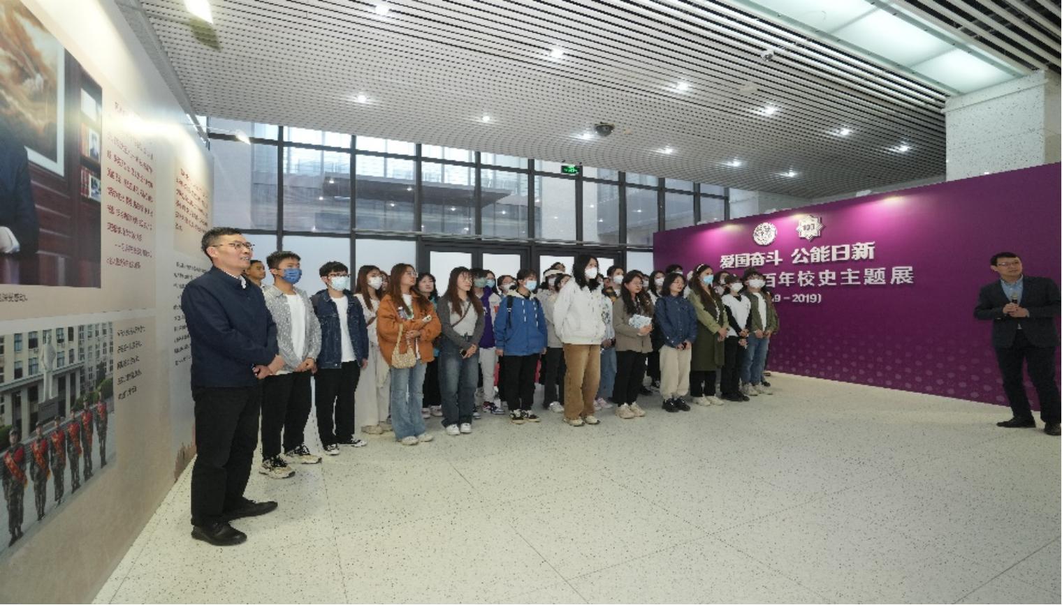 在南开大学党委宣传部、校史研究室副编审,天津市严修研究会理事长、张伯苓研究会副理事长陈鑫的讲解下,学校师生首先重温了习近平总书记视察南开大学时的重要讲话精神,接着参观了“爱国奋斗 公能日新”南开大学百年校史主题展、西南联大纪念碑、周恩来总理像、思源堂、严张纪念园等爱国主义教育场所,现场聆听了南开人百年来波澜壮阔、开拓奋进的光辉历程,深刻感受到了周恩来、张伯苓、杨石先等优秀南开人的爱国情怀。