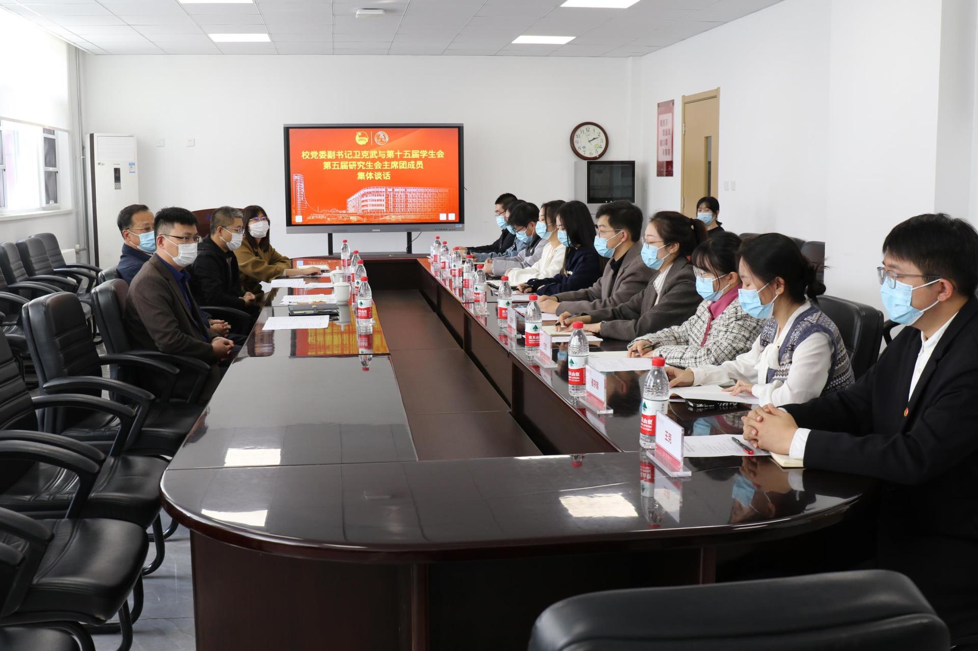 11月16日下午,学校新一届学生会、研究生会主席团成员集体谈话会在大办公楼一楼多功能会议室召开。校党委副书记卫克武对新一届主席团成员进行集体谈话。党委学工部、校团委主要负责同志参加谈话会。