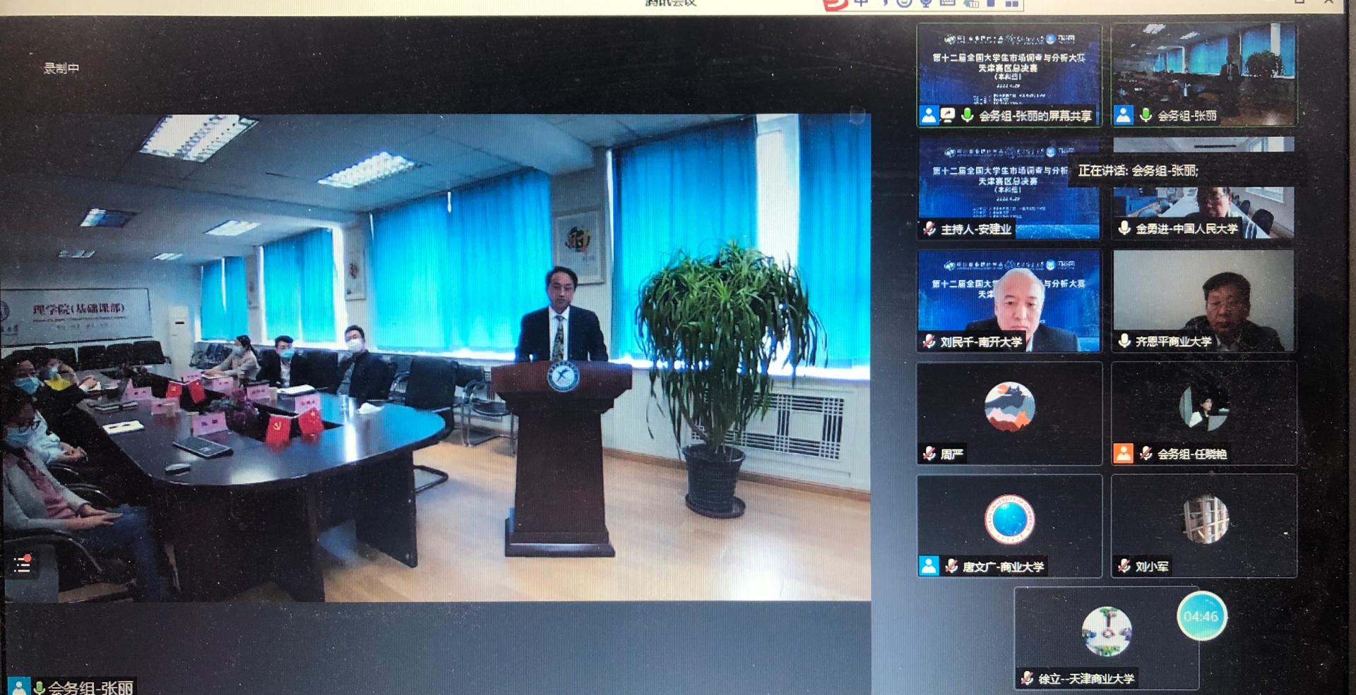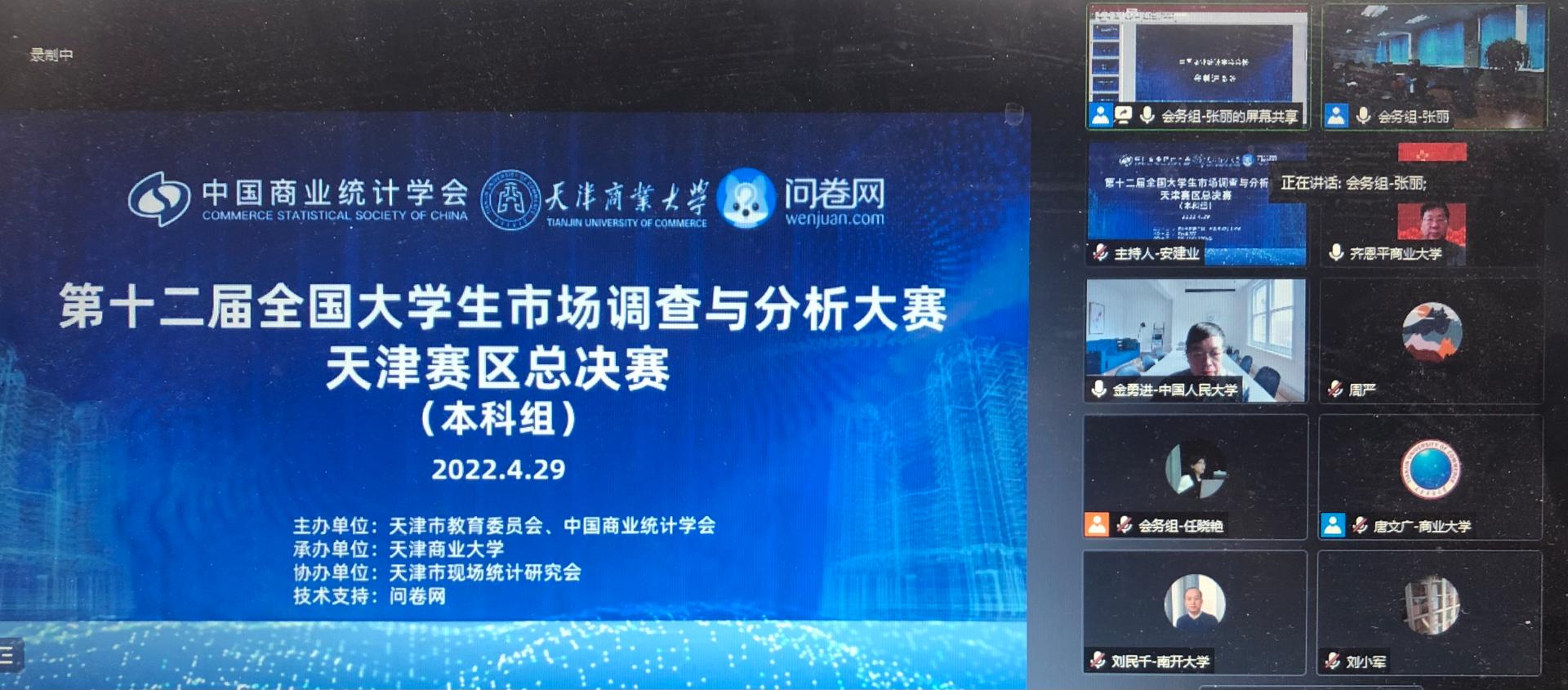4月29日,由天津市教委、中国商业统计学会主办,beat365英国官方网站承办,天津市现场统计研究会协办的第12届全国大学生市场调查与分析大赛天津赛区总决赛(本科生组)在线上举行。天津市教委高教处处长徐震、中国商业统计学会会长金勇进、beat365英国官方网站副校长齐恩平、天津市现场统计研究会理事长刘民千参加开幕式并致辞。活动由beat365英国官方网站理学院院长安建业教授主持。