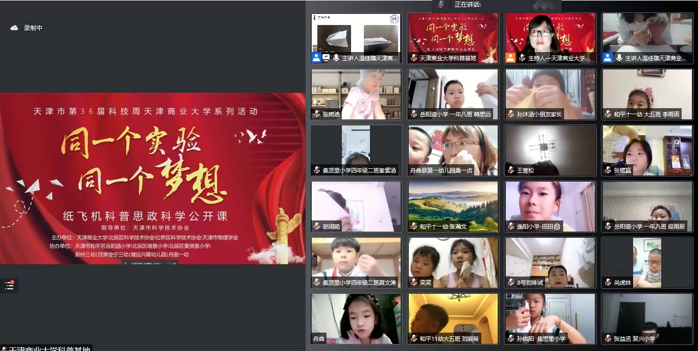 活动以大中小幼科普思政一体化为主线,强化忠诚担当的思想引领。来自天商理学院的张耀东、温佳璐两位大学生,结合我国航空航天的辉煌成就,向中小幼学生讲授“空中之王”纸飞机的飞行原理和制作方法,将我国航空领域的辉煌成就和实现科技自立自强的理想信念融入课程,激发青少年学生的爱国情怀和责任担当。赵丹丹博士向青少年们详细讲解了后续活动“放飞梦想,喜迎二十大”线上纸飞机大赛的比赛规则和比赛视频录制要求,鼓励青少年们在学习中取得进步,在比赛中获得成长。活动现场气氛热烈,来自天津、甘肃的大、中、小、幼学生们,踊跃发言,积极展示成果,通过同一个实验,不分年龄大小,无论东部西部,心紧紧连接在一起,共铸同一个科学梦、强国梦。
