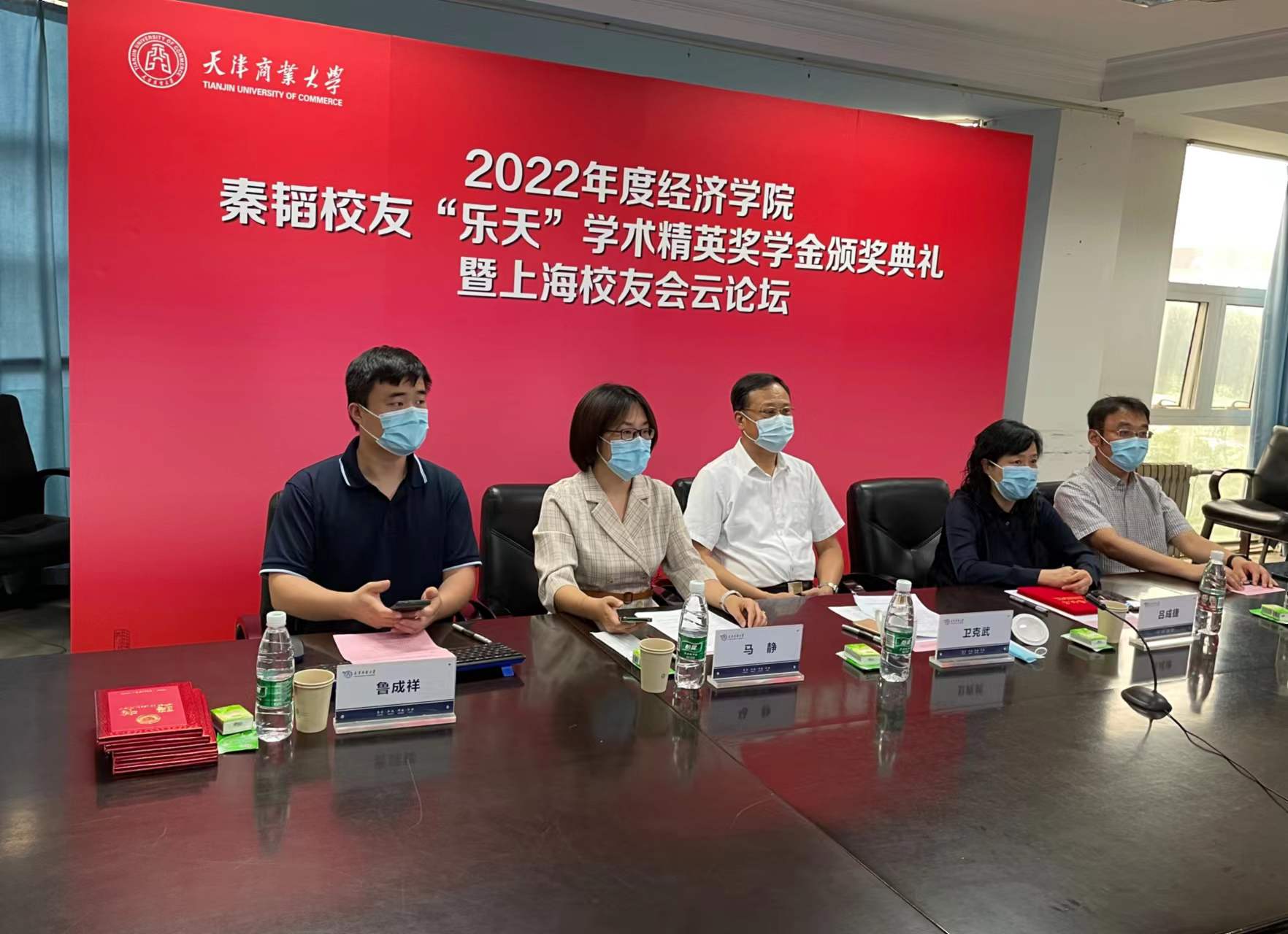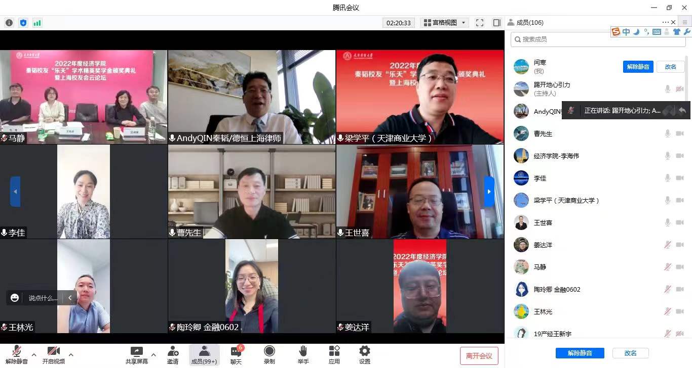 经济学院党委书记宣读《关于2022年beat365英国官方网站经济学院秦韬校友“乐天”学术精英奖学金评选表彰的决定》。获奖研究生王新宇发言。参会同学与各位校友在生涯规划、求职创业、职业理想等方面进行了深入讨论。