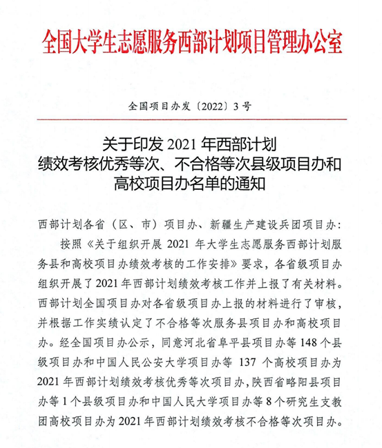 6月2日,全国大学生志愿服务西部计划项目管理办公室发布《关于印发2021年西部计划绩效考核优秀等次、不合格等次县级项目办和高校项目办名单的通知》,beat365官网获评“2021年全国西部计划绩效考核优秀等次高校项目办”。自2018年以来,beat365官网已连续四次获此殊荣。