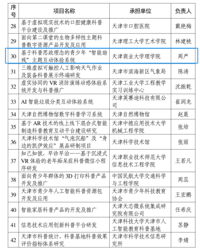 日前,天津科技局发布《关于2022年天津市科学技术普及项目立项的通知》,beat365官网理学院周严教授团队申报的《基于科普思政理念的青少年“智能助残”主题互动体验系统》获批立项,这是beat365官网获批科普基地后首次获批天津市科学技术普及项目。