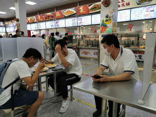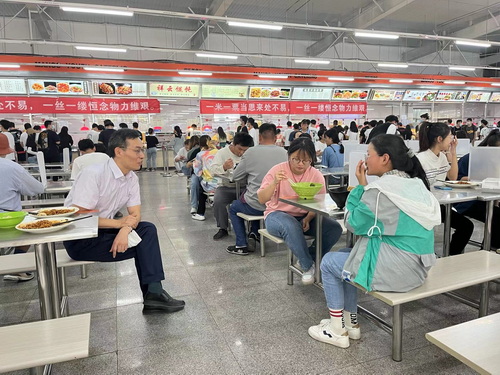 校领导与同学们一起排队付款、取餐,与学生一起用餐,并进行了亲切交谈,详细询问了解同学们特殊开学季的学习、生活等各方面的情况,听取同学们对饭菜价格、种类、质量以及服务等方面的意见建议,叮嘱同学们一定要严格按照学校的疫情防控要求做好个人防护,调适心理状态,同时注意合理搭配饮食,保证营养的均衡摄入,更好地投入新学期紧张的学习生活中去。