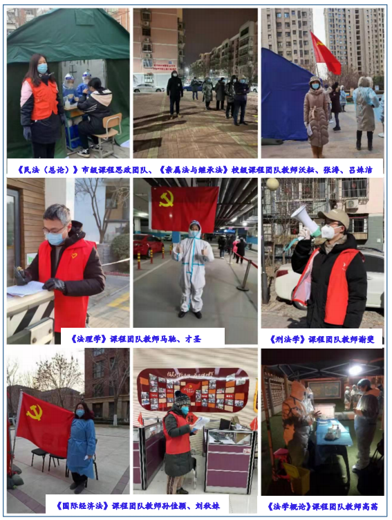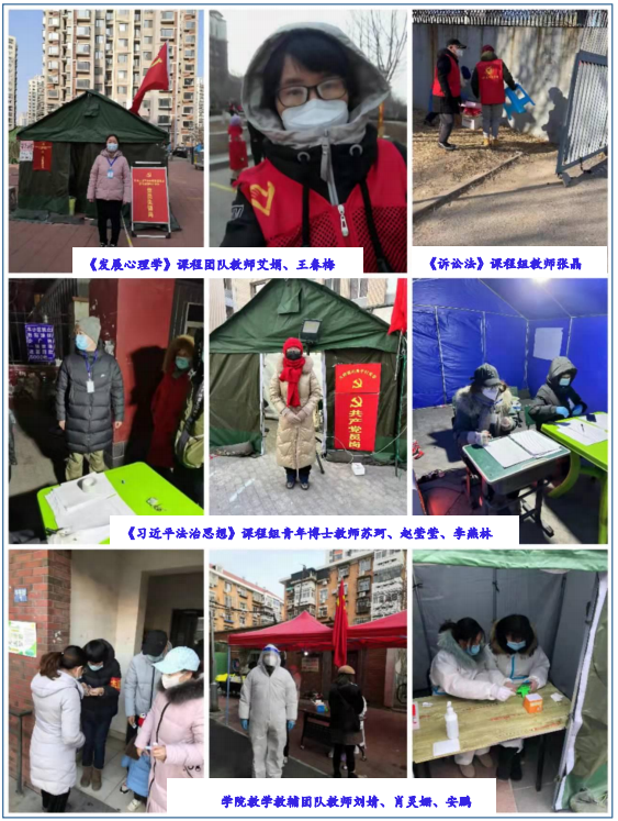 不忘师者教育初心,努力践行时代使命。在天津迎战“奥密克戎”的特殊战役中,法学院教师勇担当、先垂范,下沉基层社区参加志愿服务。教师们一致表示:“参加基层社区抗疫服务,不仅是共产党员闻令而动的政治责任,更是做好学生思想引领,进行抗疫课程思政的生动素材。要以实际行动为学生做出示范,彰显与落实课程思政育人的初心与使命。”