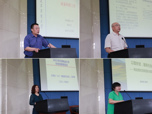 会上,天津市科技进步奖一等奖团队负责人张彦青教授、二等奖团队负责人杨永安教授、文旅融合自主创新团队负责人王庆生教授和商业模式创新服务团队负责人蒋国平教授等优秀科研创新团队代表就如何做好科研成果转化与服务做了交流发言。