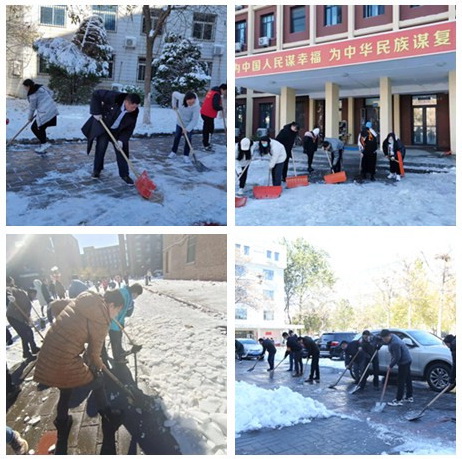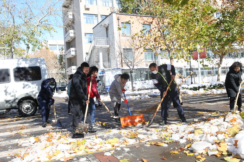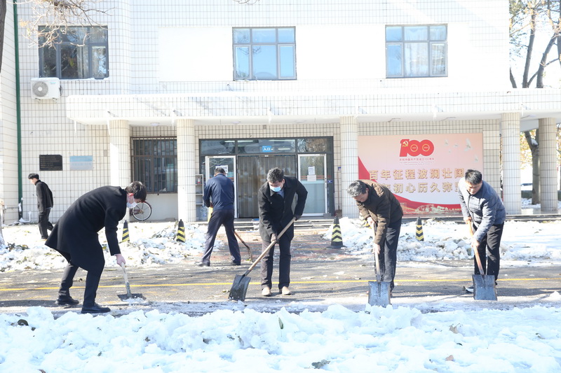 在机关党委的协调下,机关党委各支部按照“地域就近”原则,利用各种工具扫雪、除雪、铲雪,重点对综合办公楼、学工楼、老图书馆周边、后勤办公楼以及第五实验楼和学生宿舍41号楼周边的积雪、冻冰进行清除。各学院也组织教职工克服困难积极开展本单位周边的除雪活动,大家齐心协力为师生的校园出行开辟出一条“安全通道”。