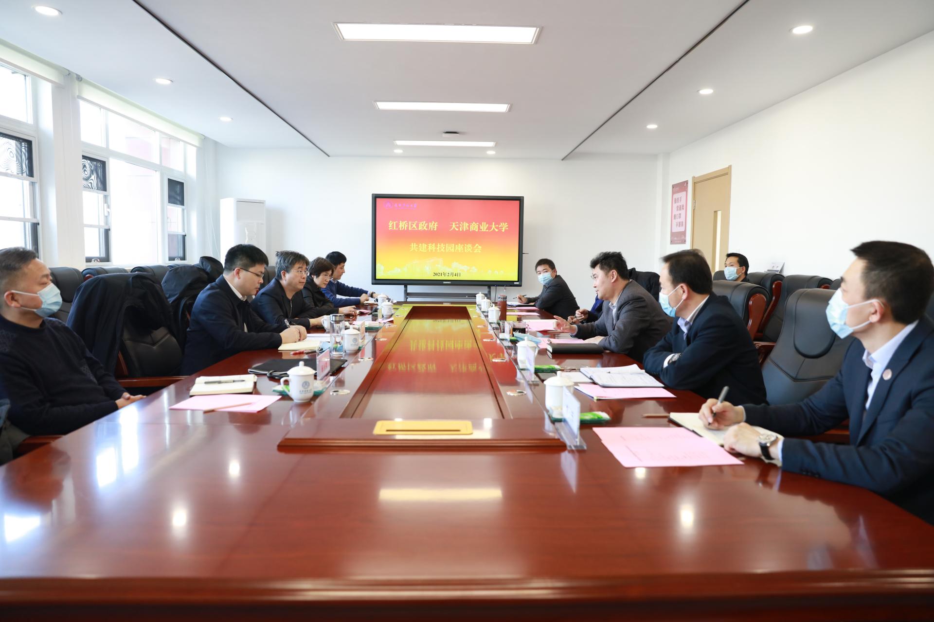 葛宝臻对何智能一行的到访表示热烈欢迎,对红桥区一直以来给予学校的支持和帮助表示衷心感谢。葛宝臻简要介绍了学校的发展历程、学科专业分布和未来发展目标。他表示,商业大学与红桥区关系密切,有良好的合作基础,今年是“十四五”开局之年,学校将进一步发挥冷链物流与现代服务业两个市级优势特色学科群的科研优势,与红桥区在产学研合作方面进一步加强沟通交流,共同探寻更多科技合作空间,共建大学科技园,努力推动优势互补,实现互利共赢。
