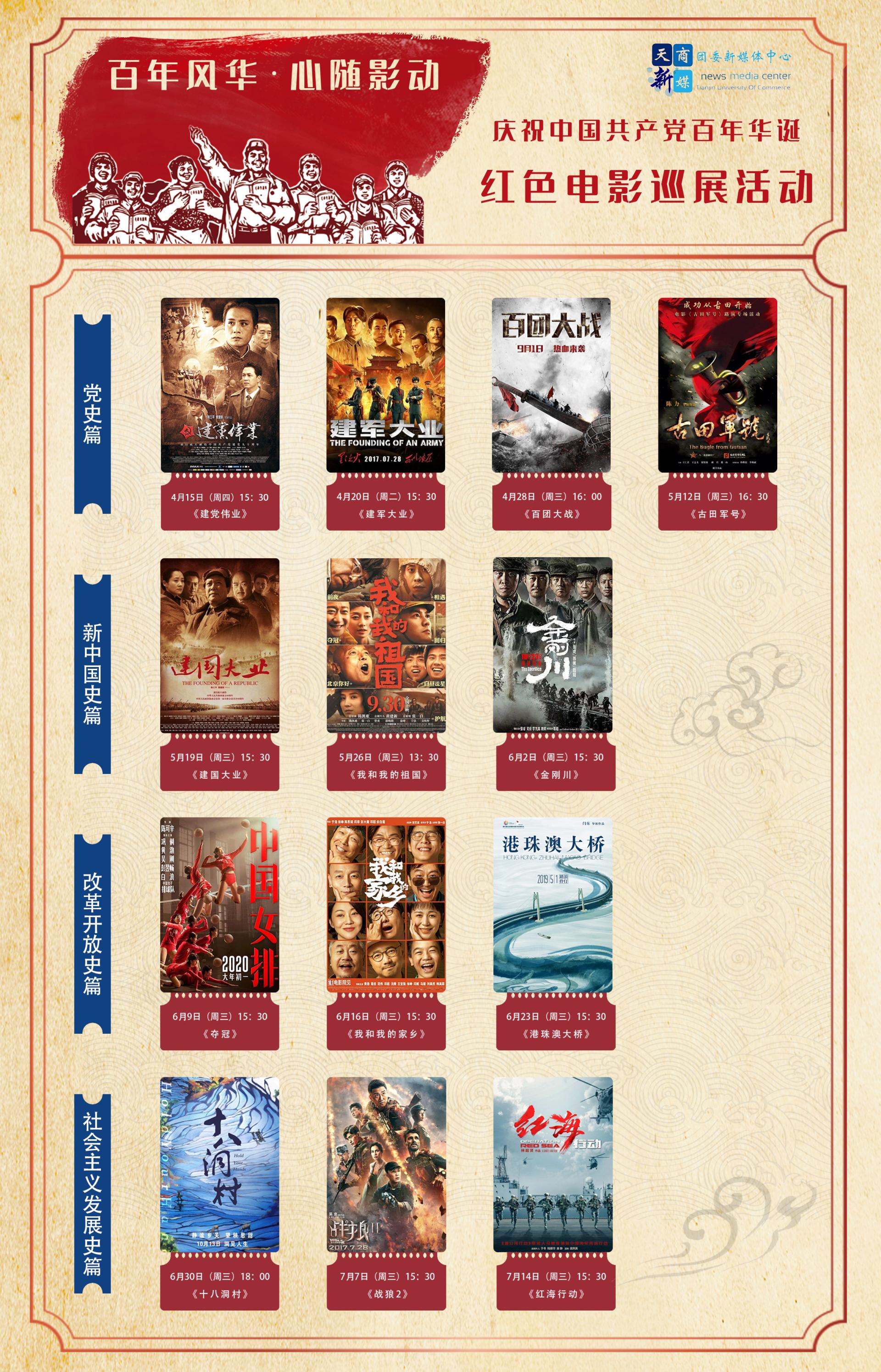 展播活动自4月14日至7月14日,每周将在科学会堂推出一部经典红色电影,面向全体师生展播。展播分为“党史篇”“新中国史篇”“改革开放史篇”“社会主义发展史篇”4个篇章,精选《建党伟业》《建军大业》《我和我的祖国》《金刚川》《红海行动》等13部经典影片,再现峥嵘岁月,缅怀革命先烈,展现中国共产党百年奋斗的光荣历史、奋斗历程和取得的辉煌成就。