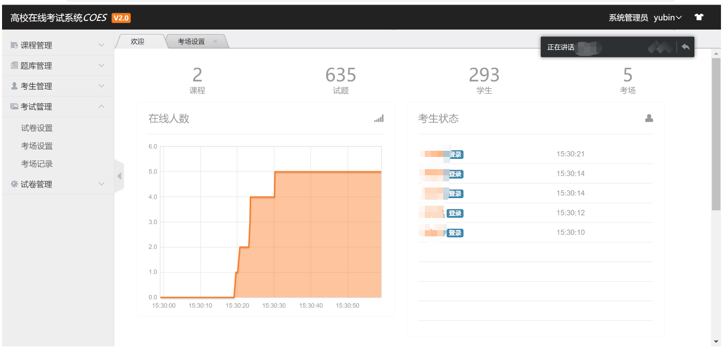 本次测试选用了学校自主研发的线上考试系统。信息工程学院作为学校国家级一流专业建设单位,充分发挥自身优势,委托尉斌老师带领技术团队,在进行详尽需求调研的基础上,针对学生的学习条件分别开发了基于计算机平台和手机平台的两套考试系统,实现了随机命题、视频监考和自动阅卷等功能。测试采用云视频会议系统搭建虚拟考场环境,监考和巡考教师分别利用线上考试平台提供的随机采集视频信息功能和视频共享功能完成了线上考生入场签到、监考和巡考等考务管理的主要工作。