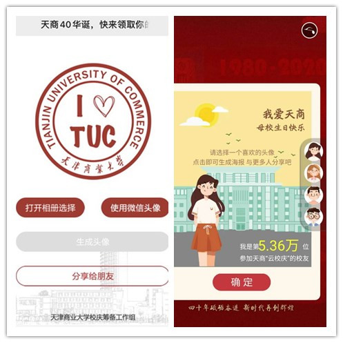 双微发力,精彩纷呈。学校官方微信特别推出校庆专栏,总计推送校庆系列推文31篇,阅读量达17万余次。设置时光隧道、学子祝福、我与天商的故事、时光留影等多个栏目,涵盖天商校门和标志性建筑的发展变迁、校园师生生活、校园风景、文艺展演等内容,校庆专属头像、VR全景漫游、H5接力祝福、学子祝福、我与天商的故事等系列推送也引起了广泛转发和强烈共鸣。推送的“天商云校庆,接力送祝福”H5信息,参与人数达5.36万人;“让我们一起换上校庆专属头像,为学校庆生吧!”推文阅读量近2万次。学校官方微博共发布校庆微博信息81条,校庆日当天还收到了来自天津大学、济南大学、中央财经大学、天津理工大学、江苏科技大学、云南大学等多所学校的祝福,信息总浏览量近42万次。