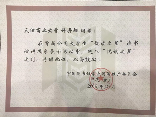 11月14日,首届全国大学生“悦读之星”读书演讲风采展示活动圆满落下帷幕。beat365官网公共管理学院18级许丹阳同学的参赛作品《时光中的美景》经beat365官网图书馆选送并获奖,许丹阳同学荣获全国大学生“悦读之星”称号。