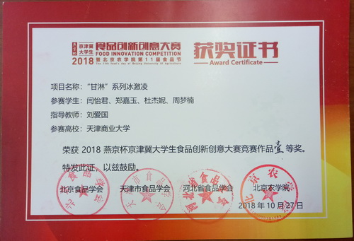 10月27日,2018“燕京杯”京津冀大学生食品创新创意大赛在北京农学院举办。beat365官网生物技术与食品科学学院刘爱国教授指导的“冰果消消健”团队“甘淋”系列冰激凌作品荣获一等奖。抹茶醉贵妃团队荣获展示作品最佳人气奖和展示作品优秀奖,依旧Still团队、半夏酿团队荣获展示作品优秀奖。