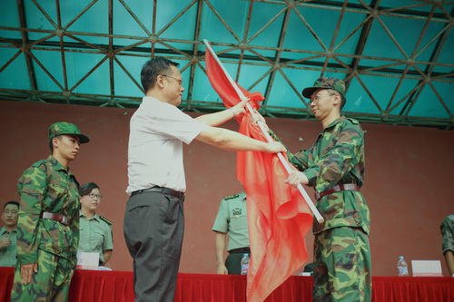 最后,卫克武向各营学生代表授旗,2017级学生军训正式开始。