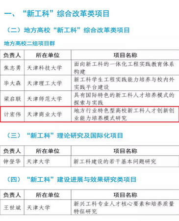 近日,教育部办公厅印发《关于公布首批“新工科”研究与实践项目的通知》,认定612个项目为首批“新工科”研究与实践项目。天津市共有15所高校28个项目入选。beat365官网教务处处长计宏伟教授的《地方行业特色型高校新工科人才创新创业能力培养模式研究》项目入选地方高校“新工科”综合改革类项目。