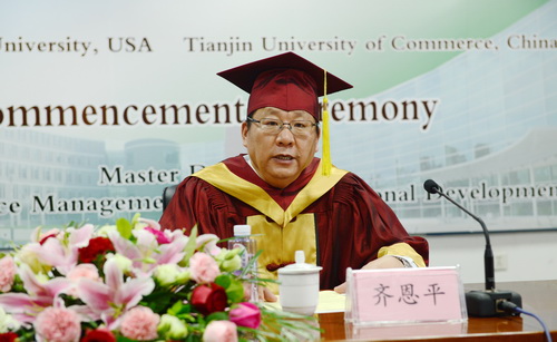 齐恩平代表学校向顺利完成学业的29名毕业生表示热烈的祝贺,向付出心血和汗水的教师团队、向关爱和支持学生成长的家人表示诚挚的敬意。他指出,中美人力资源管理硕士合作项目开办以来,始终坚持积极引进国外优质资源、先进教育理念和管理模式,充分重视项目的内涵建设与健康发展。通过双方的共同努力,已把该项目成功打造成中外合作办学品牌项目。项目开办十五年来,共培养硕士研究生206名。毕业生人数虽不多,但更加体现出中美双方对教学质量“一致性”的恪守,对品牌项目精益求精的追求,以及对国际化人才培养理念的坚持。