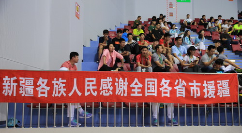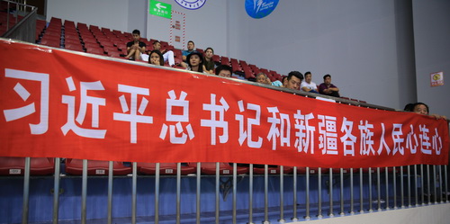 “习近平总书记和新疆各族人民心连心”、“新疆各族人民感谢全国各省市援疆”……9月7日上午,第十三届全运会跆拳道比赛场馆刮起一股民族团结和谐风,在场馆醒目位置悬挂着彰显新疆人民坚决维护以习近平同志为核心的党中央,全国各族人民手足相亲、守望相助,共同维护民族团结、国家统一的横幅。?xml:namespace>