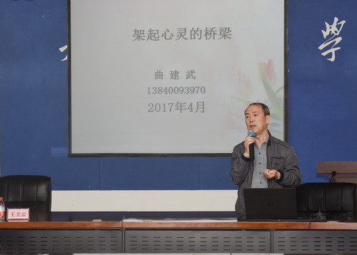 4月26日,由党委学生工作部主办,辅导员发展研究中心承办的2017年辅导员培训系列讲座在图书馆弘毅厅举行。大连海事大学大学生思想政治教育研究中心常务副主任、博士生导师曲建武教授应邀作了题为“架起心灵的桥梁”的专题讲座。马克思主义学院教师代表,各学院负责学生工作书记、副书记、全体辅导员聆听了讲座。