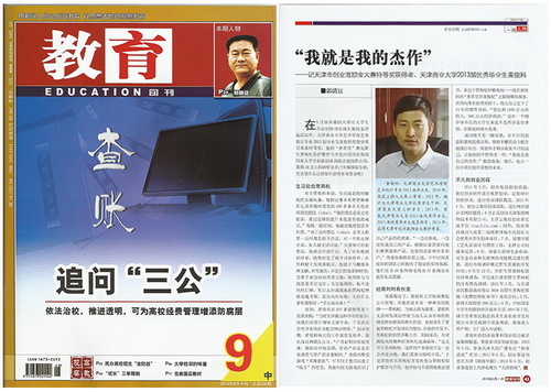《教育》杂志在2014 年9 月(第308 期)上,刊登了艺术学院艺术设计专业2013 届毕业生黄俊科的创业经历。