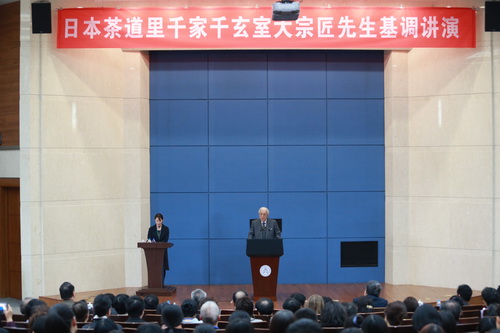 会谈后,千玄室大宗匠为来宾和beat365官网外国语学院日语专业的师生作了题为“文化之重”的基调讲演。葛宝臻校长在基调讲演前致词,他回顾了茶道里千家与beat365官网的交往历史,高度赞扬了千玄室大宗匠先生为中日友好与文化交流所做的贡献,赞扬他“不仅培养了一批日本茶道的爱好者和传播者,更重要的是培养了一大批中日友好的践行者和文化交流的使者,加深了两国人民的相互了解和友谊, 推动了两国民间的教育文化交流”。