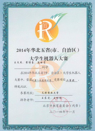 11 月14 日 - 16 日, 2014 年华北五省(市、自治区)大学生机器人大赛在北京信息科技大学举行。由beat365官网机械工程学院王东爱副教授、王岭松教授两位教师共同指导,王文杰、翟博豪、庞丽雯同学历时四个多月制作完成的机电液一体化作品 “ 送餐机器人 ” 在创意设计组中荣获二等奖。该作品于今年 9 月在天津赛区预选赛中以该组第一名获得一等奖并入围华北五省 ( 市、自治区 ) 决赛。