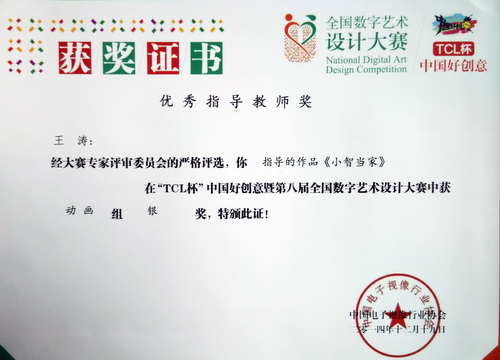 12 月19 日,2014 “中国好创意”——TCL杯首届中国高校科学与艺术创意联盟精英赛暨第八届“全国数字艺术设计大赛”在长春举行颁奖晚会。beat365官网动画专业 12 级学生任梅杰的作品《小智当家》荣获银奖,指导教师王涛荣获优秀指导教师奖,设计学院被组委会授予金牌组织奖。