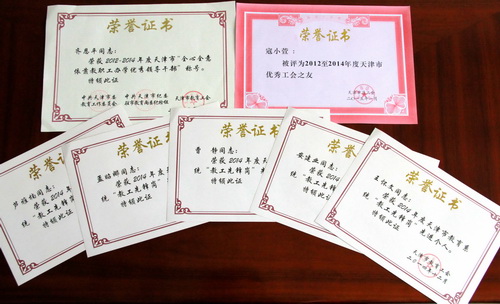 校工会获“ 2012-2014 年度天津市模范职工之家”,寇小萱获“ 2012-2014 年度天津市优秀工会之友”,齐恩平获“ 2012-2014 年度天津市全心全意依靠教职工办学领导干部”,理学院数学系、经济学院国际经济与贸易系获 2014 年度天津市教育系统“教工先锋号”,王怀文、安建业、曹静、孟昭娜、芦雅楠获 2014 年度天津市教育系统“教工先锋岗”,吴军提出的《推进财务信息化建设,提高财务服务能力》合理化建议获 2014 年度天津市教育系统“我为教育事业发展献一计”活动“优秀合理化建议和教代会提案”奖,张莹获“ 2014 年度天津市教育系统工会信息先进个人”。