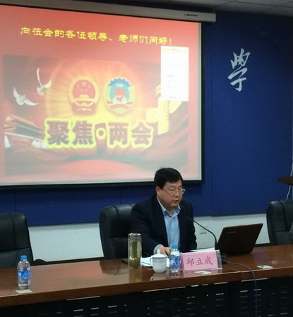 报告会上,邱立成副校长以我国政治体制的基本构成开篇,向同学们介绍了国家党政机关的构成及职责,详细讲解了党委、政府、两院和政治协商会议各自的职责等。作为 “ 两会 ”的亲历者,邱立成副校长用图文并茂地形式进一步为广大师生阐述了2014 年经济发展的成绩单和2015 年重点战略部署,以 2015 年政府工作报告为主线,传达了今年的两会精神以及 “ 两会 ” 中讨论的主要议题,并对“节能减排”、“反腐”、“互联网+ ”、“3P 模式”、“中国制造 2025 ”等倍受关注的议题进行了详细解读,还对当前国内的宏观经济形势作了分析与预测,用诙谐幽默、“接地气”的语言阐述了自己的学术观点。