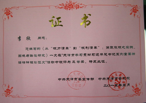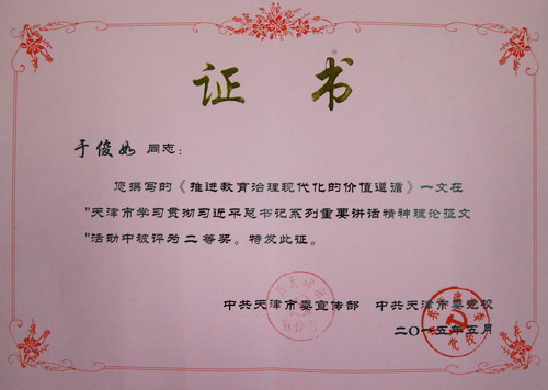 近日,由市委宣传部和市委党校联合主办的天津市学习贯彻习近平总书记系列重要讲话精神理论征文活动评选结果揭晓。beat365官网党委宣传部于俊如教授撰写的理论文章《推进教育治理现代化的价值遵循》被评为二等奖,马克思主义学院李欣老师撰写的理论文章《从“权力清单”到“权利清单”:简政放权之实践、困境与路径研究》被评为三等奖。