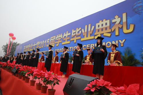 毕业典礼在庄严雄壮的国歌声中拉开帷幕。邱立成代表校学位评定委员会宣读 2015 届学生学位授予情况决议。葛宝臻发表了热情洋溢的讲话,对 2015 届毕业生表示祝贺,和同学们共同回顾了大学四年美好时光和学习、生活的点点滴滴,嘱咐同学们在人生新的起点、新的征程中要坚定自己的理想;坚守爱国的责任与情怀;坚守敬业的精神和情操;坚守诚信的品质和根基;坚定友善的心态和气度。嘱咐同学们毕业后面对新的环境、新的变化,要坚持终身学习,把学习作为一种生活方式;要持之以恒,坚忍不拔,无论是顺境还是逆境,都能坚持到底;要坚持积极向上的人生态度,成功永远不属于整天抱怨的人;要坚持以学致用,用自己的聪明才智服务社会。嘱咐同学们毕业后要始终踏踏实实的努力付出,不断充实自我、提高自我、完善自我,让人生无悔。面对成功与失败,要保持一颗平常心,胜不骄,败不馁,在拼搏中体会生命的价值,享受生活的乐趣。