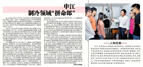 11 月 19 日,《天津工人报》以《制冷领域“拼命郎”》为题刊登了全国先进工作者、全国五一劳动奖章获得者、天津市劳动模范机械工程学院院长申江教授的先进事迹。全文如下: