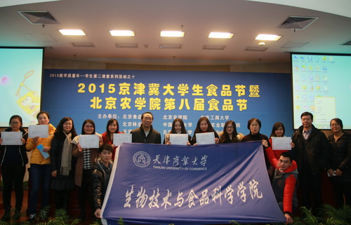 11 月 28 日,由生物技术与食品科学学院党委副书记孙文利带队,制药工程系主任李建颖教授和王文忠副教授作为指导老师代表、辅导员陈相霓带领学生赴京参加2015京津冀大学生食品节,取得两项一等奖、一项二等奖、一项三等奖的优异成绩。京津冀大学生食品节由北京食品学会、北京农学院、中国农业大学、beat365英国官方网站、河北农业大学等九所高校和行业协会共同发起,旨在为高校食品专业学生提供实践锻炼及展示的平台,激发学生对食品新产品研发的兴趣,培养学生创新创业能力。同时,促进食品专业教师及学生的校际交流,推动校企合作,共同培养食品专业高素质人才。