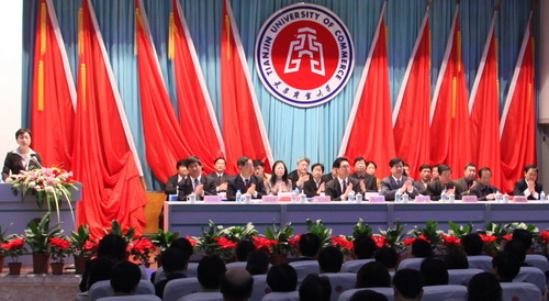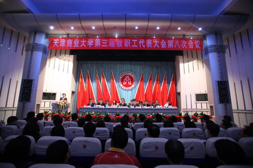 《报告》分析了当前面临的形势和任务。认为面对 2009 年的发展形势,我们既面临巨大的困难,同时又可寻找许多的机遇,我们必须保持清醒头脑,科学分析,积极应对,化危为机,加快发展。我们要继续深入贯彻落实党的十七大精神,深入开展学习实践科学发展观活动,主动融入滨海新区开发开放进程,谋划好学校的建设和发展。全力培养复合型创业型应用人才,实现以社会需求为导向的人才培养机制;全面推进教学质量工程建设,实现国家级教学质量工程建设项目的新突破;进一步提高科研质量和水平,在科研立项和科研获奖方面力争新的突破;进一步完善学校管理体制,实施人事分配制度改革;坚持以人为本,把教职工利益放在首位,切实改善教职工生活。做好今后的工作必须做到三个坚定不移:一是坚定不移地贯彻学校的办学指导思想和奋斗目标、工作思路,按照高等教育规律办事;二是坚定不移地实施重点发展战略、特色发展战略和国际化发展战略;三是坚定不移地立足地方,围绕现代服务业服务天津经济社会发展,提高学校的社会影响。
