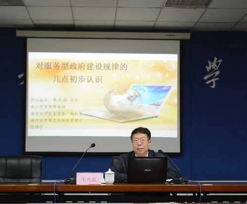 12月4 日,我国著名政治学家、长江学者特聘教授、南开大学副校长朱光磊教授应邀在图书馆弘毅厅作了题为“对服务型政府建设规律的几点初步认识”的学术讲座。讲座前,副校长齐恩平会见了朱光磊,对朱光磊来校讲座表示热烈欢迎和衷心感谢。社科管理处领导、公共管理学院党委书记白洪文、副院长关兴丽、行政管理系教师和硕士研究生、部分本科生聆听了讲座。公共管理学院副院长李增田主持讲座。