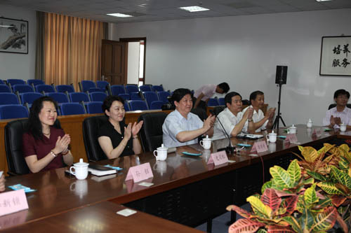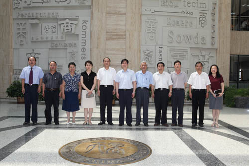 双方领导在图书馆商字墙前合影留念