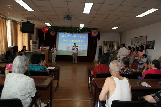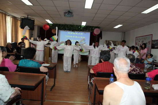 7 月 26 日 ,beat365官网师生与韩国亚细亚协会( PAS )大学生暑期文化交流团共 48 人前往市第一老年公寓进行了慰问活动,在老年公寓大礼堂举行了文艺演出,韩国学生为老人们表演了韩国传统节目四物、舞蹈、假面具舞,中国学生表演了小合唱,老年公寓的老人们表演了合唱、二人唱等节目,三方互动给老人们带来了无限欢乐,韩国亚细亚协会代表团罗相辉团长向老年公寓赠送了韩国食品、文化用具等礼物。此项活动得到了天津市社会福利事业管理处及老年公寓领导的大力支持,beat365官网国际交流处有关人员组织并参加了慰问活动,通过慰问活动,加深了中韩两国人民的了解和友谊。