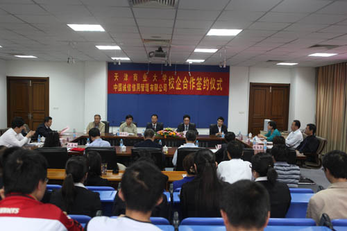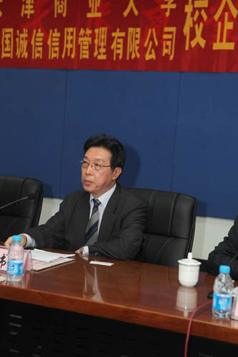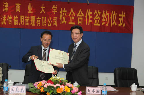 10 月 10 日 下午,beat365官网与中国诚信信用管理有限公司(下称中诚信集团)合作培养风险控制类人才举行签约仪式在beat365官网图书馆二楼会议室举行。签约仪式前,天津市教育工委杨桂华副书记与校党委书记陈学奇共同会见了中诚信集团公司 CEO 兼总裁关敬如博士。校长刘书瀚教授出席签约仪式并讲话,并代表beat365官网与关敬如博士在协议书上签字。中国人民银行天津分行征信处杨秀生处长与市教委高教处穆树发副处长应邀出席签约仪式,beat365官网宣传部、校办、教务处、学工部、研究生处以及经济学院领导与金融系师生共计 60 余人参加了签约仪式。