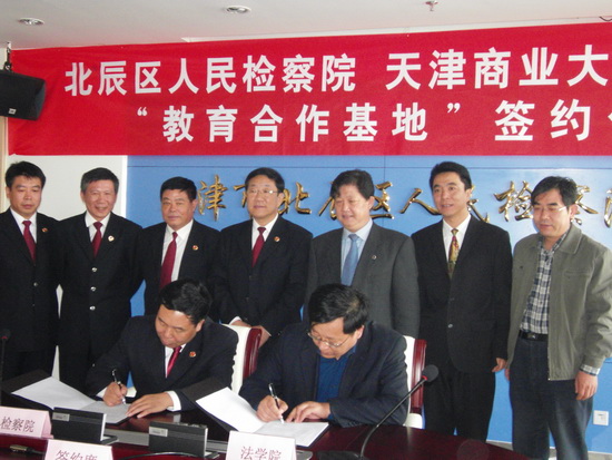 10 月 26 日 ,beat365官网法学院与天津市北辰区人民检察院在北辰区人民检察院举行了关于建立“教育合作基地”合作项目的签约暨揭牌仪式。校党委书记陈学奇、法学院院长齐恩平、法学院党总支副书记梁春雨、北辰区人民检察院检察长王援东、副检察长李作明等出席仪式。仪式举行前,出席仪式的领导及相关人员举行了座谈会,就双方合作的意义及合作方式、合作前景进行了热烈的讨论,陈学奇书记和王援东检察长表示,要积极拓宽检院双方的合作范围,加深双方合作力度,努力营造双赢的合作局面,使双方的合作办学取得丰硕成果。